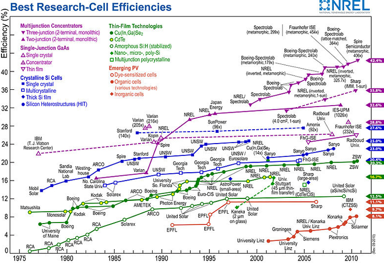 Hiệu suất của pin mặt trời là gì? Đó là hiệu suất biến đổi năng lượng (conversion efficiency) của pin mặt trời., là tỉ số giữa lượng điện năng nó sản xuất ra với lượng năng lượng nó nhận được từ ánh sáng mặt trời. Khi hiệu suất biến đổi càng cao, pin mặt trời sản xuất ra nhiều năng lượng hơn. Hiệu suất biến đổi của pin mặt trời là do cấu tạo của nó (xem thêm ở mục sản phẩm/solar/pin mặt trời) Bảng đây cho ta tham khảo hiệu suất này
